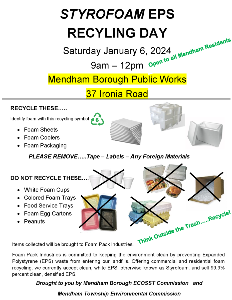 News & Announcements Back to Article List Please select a year. 2026 2025 2024 2023 2022 2021 2020 2019 2018 2017 2016 2015 2014 2013 2012 2011 2010 2009 Styrofoam Recycling Event This Saturday Release Date: January 04, 2024 View Printable News Story Online Payments Applications~Permits Licenses~Fees Schedule Citizen~Contractor Portal Meetings Dates~Agendas~Minutes Borough Code Mendham Messenger Community Links Services~Organizations About Mendham~History Contact Us Fees Schedule Legal Notices Hours of Operation Monday-Friday 9:00 AM to 4:30 PM