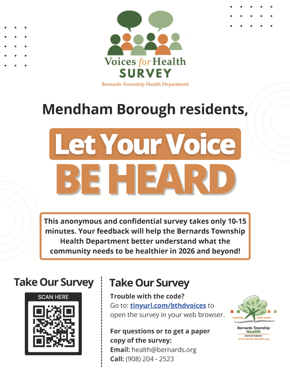 Our local public health department, in coordination with the Mendham Borough Board of Health, is seeking your input about the health needs and priorities of our community. We invite you to take 10–15 minutes to complete the anonymous and confidential survey: www.tinyurl.com/bthdvoices
