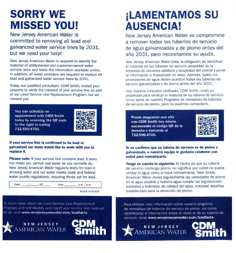 NJ American Water has contracted with CDM Smith to visit customers located within the Borough. The purpose of this is to verify the water supply line to the residence or business is NOT Lead or galvanized. They are not solicitors.