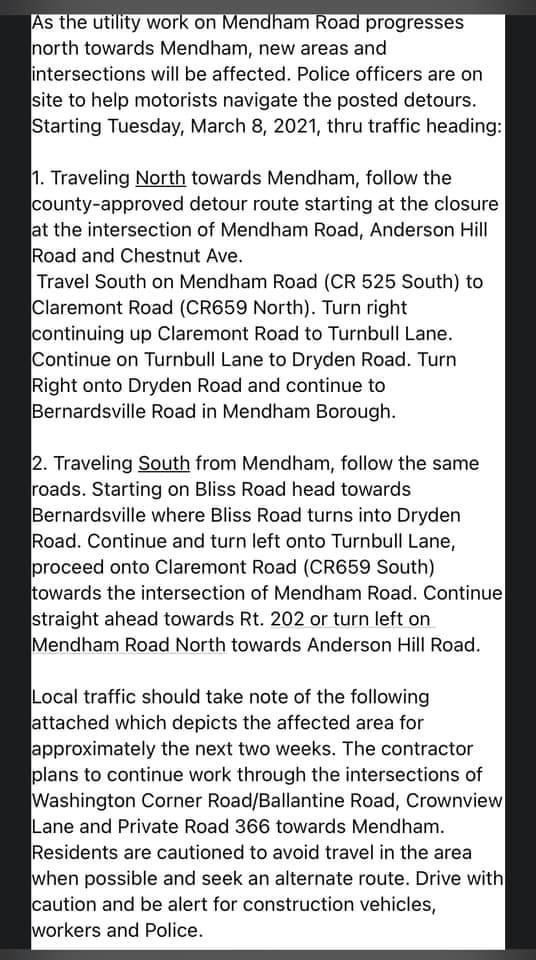 Heads Up. Road work is starting in Bernardsville on Mendham Road (CR525) our Bernardsville Road tomorrow. See below for detour information. The detour will be from 9am to 4pm