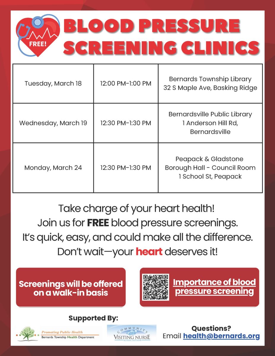 Take charge of your heart health with a FREE blood pressure screening. All screenings will be offered on a walk-in basis. For more information about the importance of blood pressure screening click here. Questions? Email health@bernards.org.
