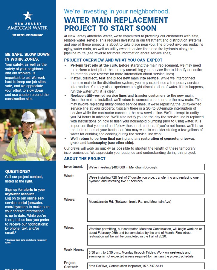 Please be advised that NJ American Water will be working on Mountainside Road (between Ironia Road and Mountain Avenue) beginning on or around February 26. Work hours will be 8:30 a.m. to 2:30 p.m., Monday through Friday. Please click here for more information.