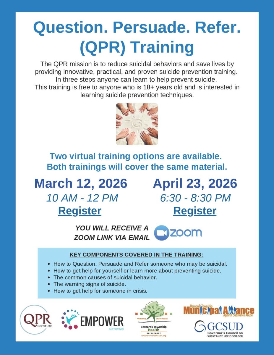 The Bernards Township Municipal Alliance and the Bernards Township Health Department will be sponsoring two QPR (Question, Persuade, Refer) Suicide Prevention Trainings in partnership with EmPoWER Somerset. This training is free to anyone over the age of 18 who is interested in learning suicide prevention techniques.
