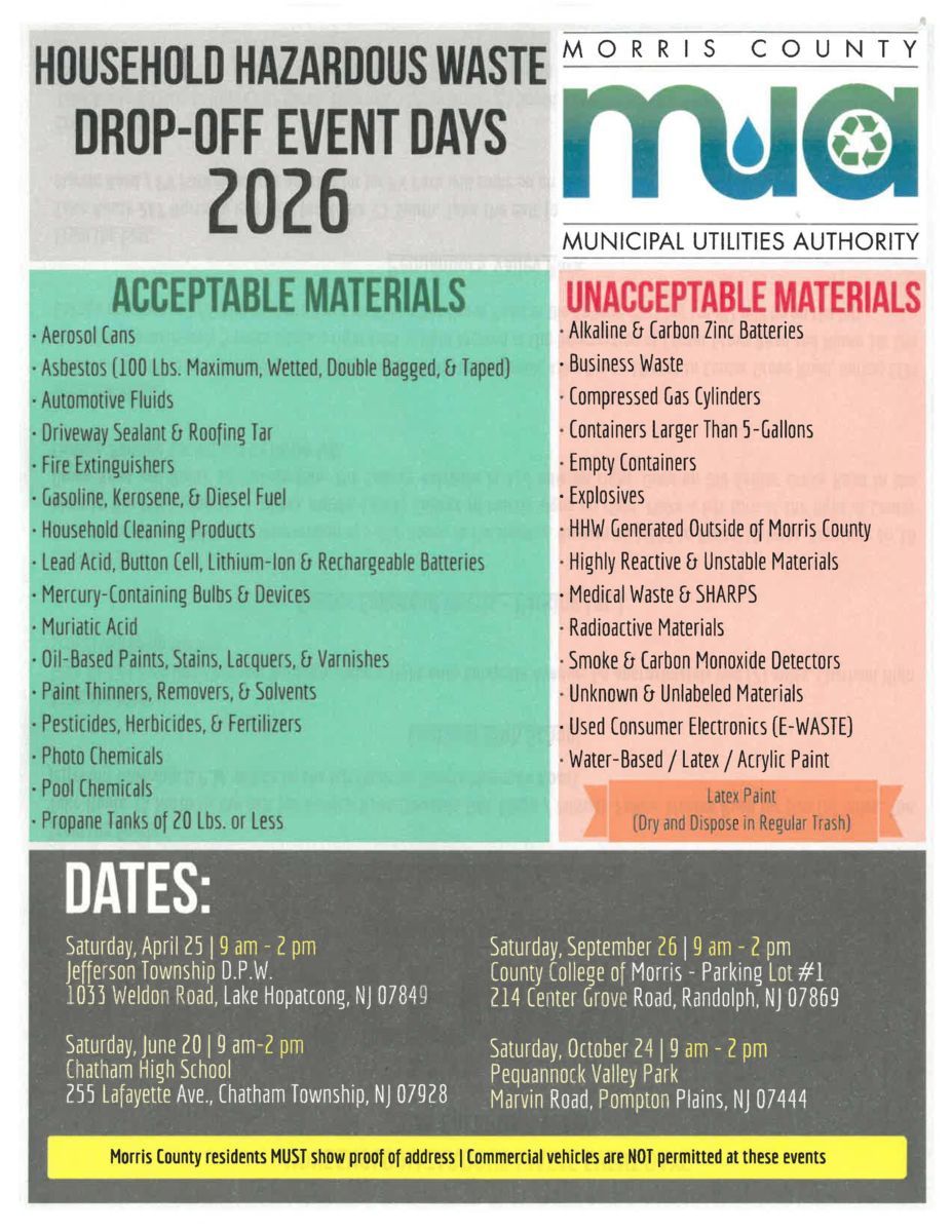 The Morris County MUA runs a Household Hazardous Waste facility where county residents may drop off specified items by appointment. They also run multiple household hazardous waste drop-events where residents may drop-off these materials without an appointment.